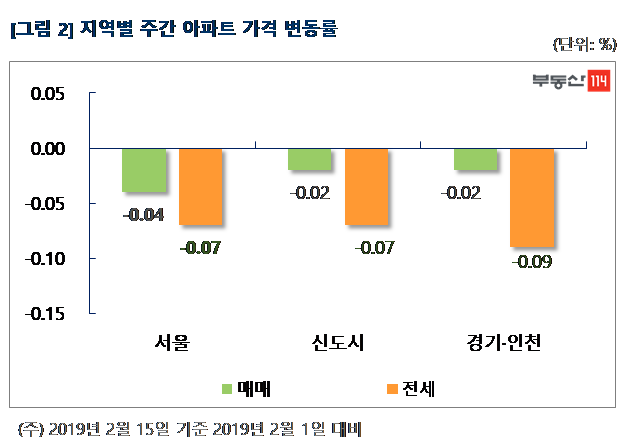 부동산114(www.r114.com)에 따르면 금주 서울 아파트값은 0.04% 떨어져 13주 연속 하락했다. 서울 재건축 시장도 0.09% 하락해 15주 연속 내림세다. 신도시와 경기ㆍ인천은 각각 0.02% 떨어져 5주 연속 약세를 나타냈다. 전세가격도 서울과 신도시, 경기ㆍ인천지역 모두에서 하락했다. 서울이 0.07% 떨어졌고 신도시와 경기ㆍ인천도 각각 -0.07%, -0.09% 변동률을 나타냈다.