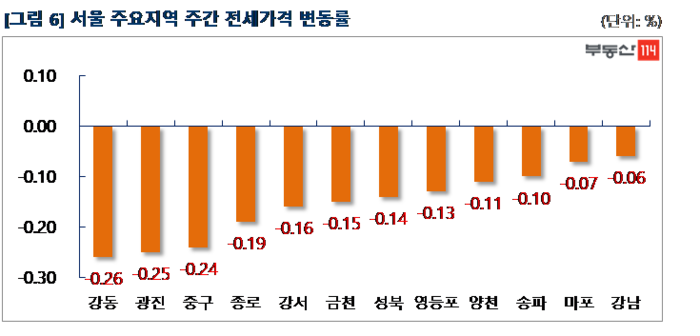 서울은 송파구 헬리오시티 등 강남권 대규모 입주에서 시작된 전세가격 하락세가 강동을 넘어 광진, 중구, 종로 일대로 확산되는 분위기다. ▼강동(-0.26%) ▼광진(-0.25%) ▼중구(-0.24%) ▼종로(-0.19%) ▼강서(-0.16%) ▼금천(-0.15%) 순으로 하락했다. 강동은 암사동 프라이어팰리스가 1,000만원, 명일동 삼익그린2차가 1,000만원-1,500만원 떨어졌다. 광진은 자양동 더샵스타시티가 2,500만원, 광장동 광장현대9단지가 2,000만원 하락했다. 중구는 신당동 남산타운이 500만원-1,000만원, 종로는 숭인동 롯데캐슬천지인과 창신동 브라운스톤창신이 250만원-1,750만원 떨어졌다.
