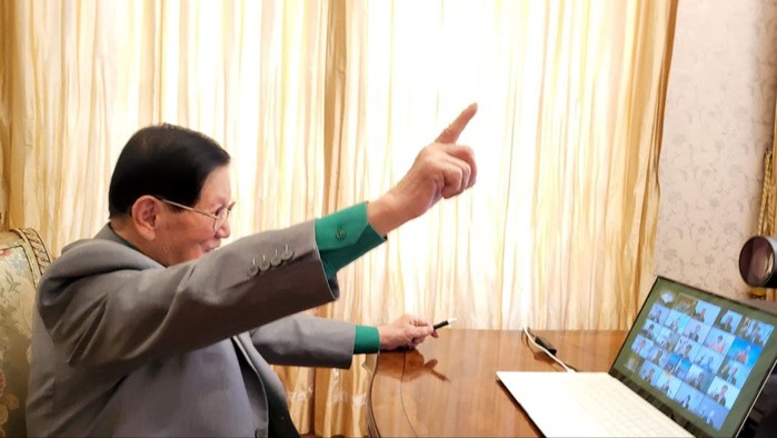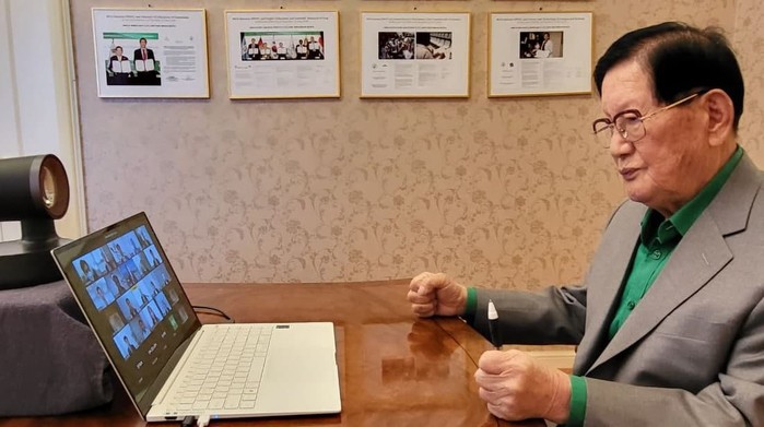 | ▲ 25일 열린 신천지 온라인 세미나 간담회에 참여한 이만희 총회장 |