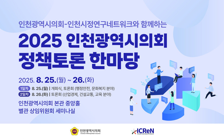 각 상임위원회 별로 진행될 토론 주제로는 ▶인천광역시 주민안전협의체 구축 방향(행정안전분야) ▶아동.청소년 디지털 성범죄 피해 지원 강화 방안(문화복지분야) ▶공공하수처리시설 유입수 수질 연속 자동측정기기(TMS) 도입(산업경제분야) ▶건설.교통분야 특성을 반영한 인천 공기업 ESG 경영 현황 및 미래전략(건설교통분야) ▶인천형 학생 지속가능 정신건강 역량 강화 통합 모델 구축과 확산 방안(교육분야) 등으로 각 분야 패널들의 열띤 토론이 진행될 예정이다.