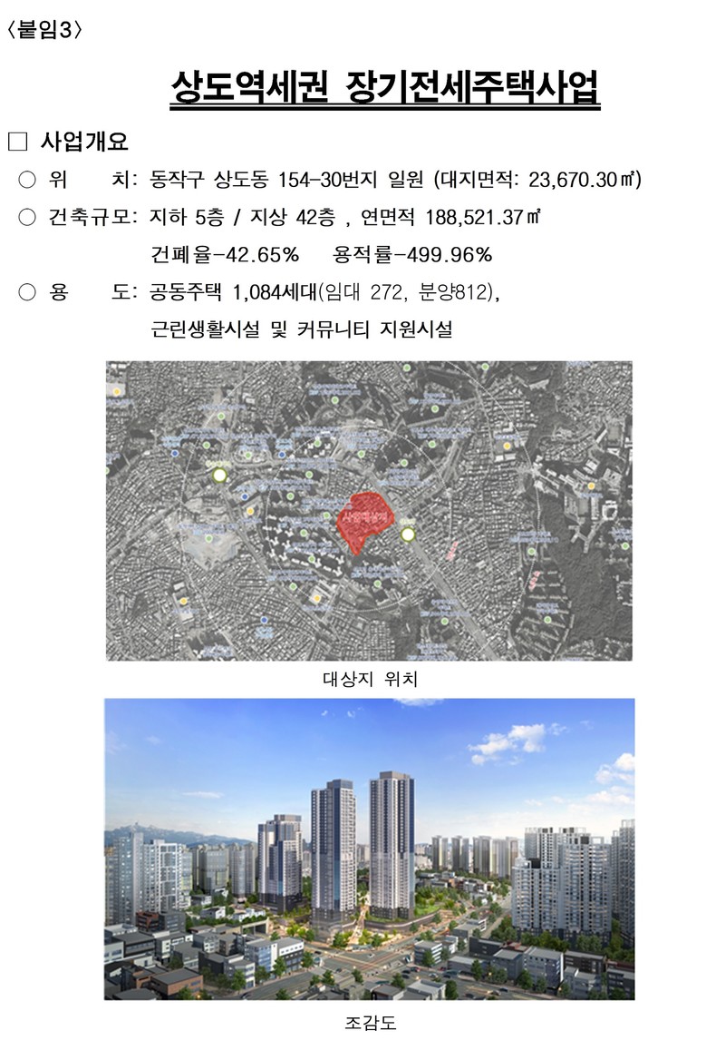 상도역 일대 역세권에 지하 5층·지상 42층 총 1,084세대 규모로 공공주택이 공급된다. 장기전세주택 등 공공임대 272세대가 포함된다.