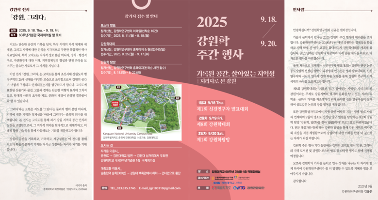 그 밖에도 강원학 포스터 발표와 지역 도서전 등 다양한 행사도 진행될 예정이다. 강원학 성과의 향유를 위한 강원학 주간 행사에 많은 참여와 관심을 바란다.