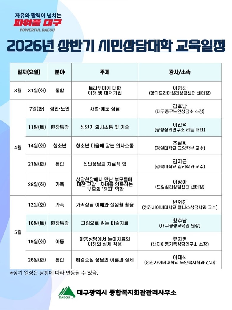 ▸ 대학교수 및 상담 전문가 초빙… 현장감 있는 교육 제공 [세계타임즈=대구 한윤석 기자] 대구광역시 종합복지회관은 오는 3월 31일부터 5월 26일까지 심리상담에 관심 있는 일반 시민과 상담 관련 종사자를 대상으로 ‘2026년 상반기 시민상담대학’을 운영한다.
