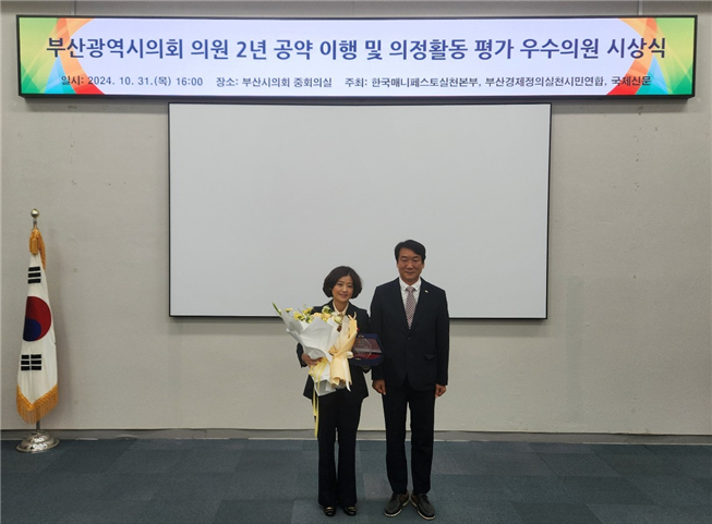부산광역시의회 윤리특별위원장 김효정 의원(국민의힘, 만덕ㆍ덕천)은 10월 31일 시의회 중회의실에서 열린 ‘부산광역시의원 매니페스토 시상식’에서 ‘공약이행 우수’를 수상했다.