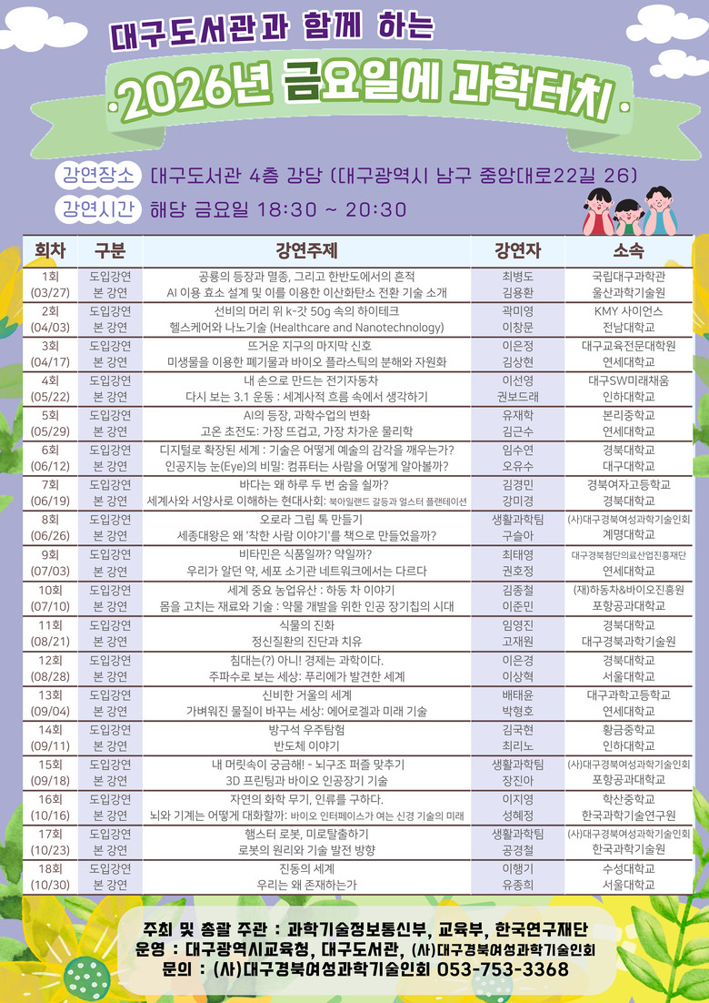 이번 프로그램은 오는 3월 27일부터 10월 30일까지 매주 금요일(18:30~20:30) 총 18회에 걸쳐 대구도서관 강당에서 진행된다. 강연은 일상 속 과학 원리를 이해할 수 있는 도입 강연과 최신 연구 성과를 소개하는 본 강연으로 구성된다.