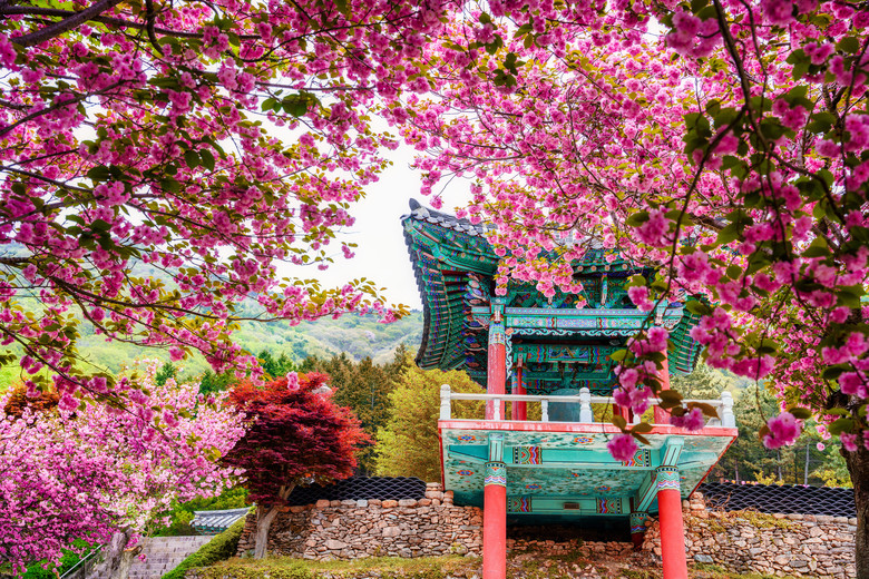 ▲(사천) 청룡사 겹벚꽃 = 사천 청룡사는 4월이면 분홍 겹벚꽃이 송이송이 피어나는 명소이다. 고즈넉한 사찰과 분홍 겹벚꽃이 어우러진 전경은 감탄을 자아내게 한다. 청룡사 곳곳마다 봄 향기 가득한 겹벚꽃 사진 명소가 가득하다.