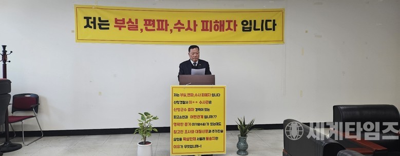 [세계타임즈 = 이판석 기자] 경남 산청군에서 팬션업을 하는 K모씨와 투자자 6명이 산청군수 출마 경력이 있는 L씨와의 부동산 매입과정에서 발생한 소송사기 사건과 관련 산청경찰서가 편파수사를 하고 있다며 1인 시위를 벌이며 억울함을 호소하고 있다.