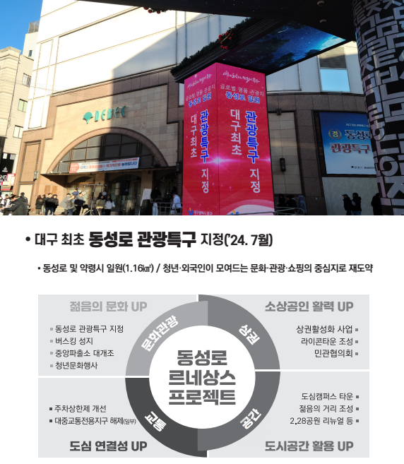 또한, 관광특구 지정, 젊음의거리 조성, 청년 버스킹 등 동성로 르네상스를 통해 문화·관광의 중심지로 재도약하고 있다.
