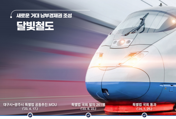 영·호남을 연결하는 달빛철도는 헌정사상 최다 261명의 국회의원 발의를 거쳐 올해 2월 특별법이 제정됐으며 예타통과 면제 등 관련 절차가 진행 중이다.