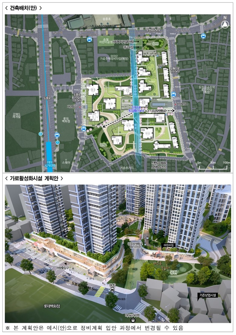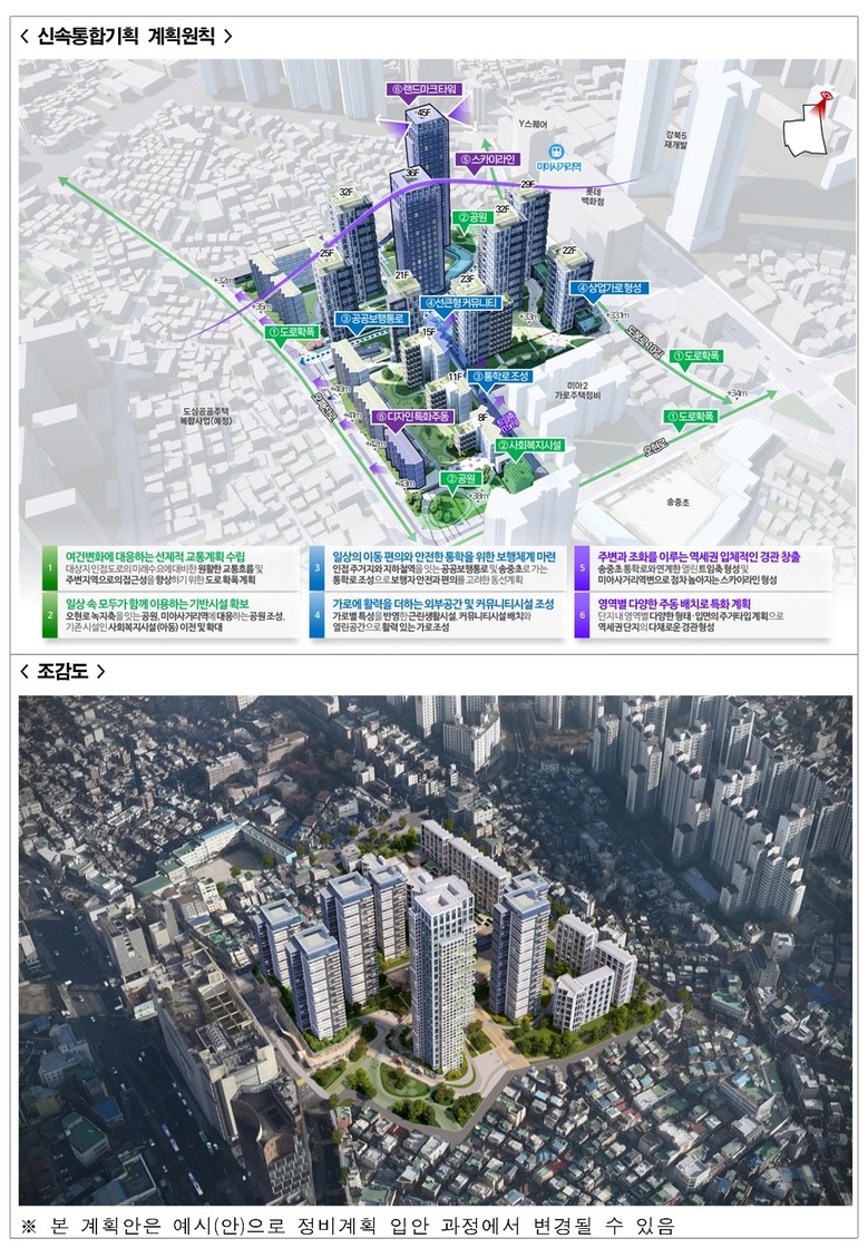 - 향후 세대수 증가 등 고려한 도로 확폭, 미아사거리역 인근 공원, 유연한 높이 계획