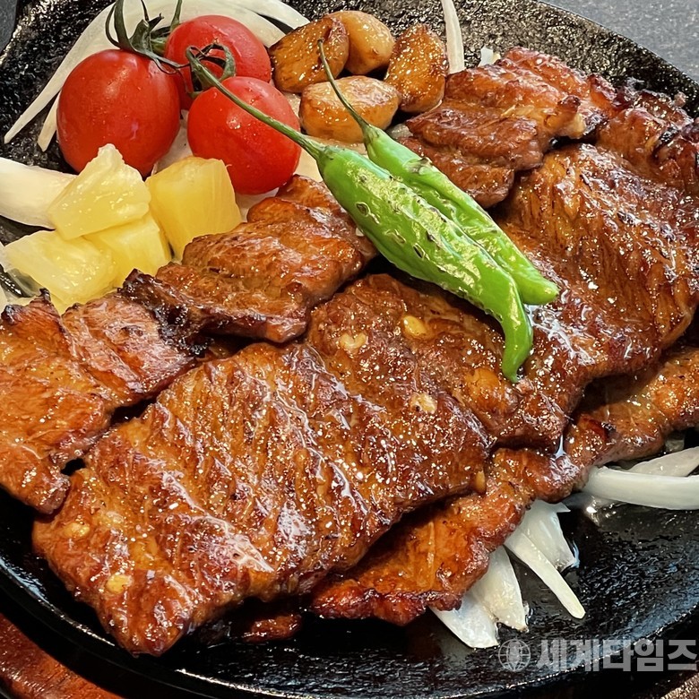 ▲ 참숯에 초벌한 돼지구이가 철판 위에서 지글지글 익는다. 은은한 양념과 불맛이 어우러져 입안 가득 고소함을 남긴다.