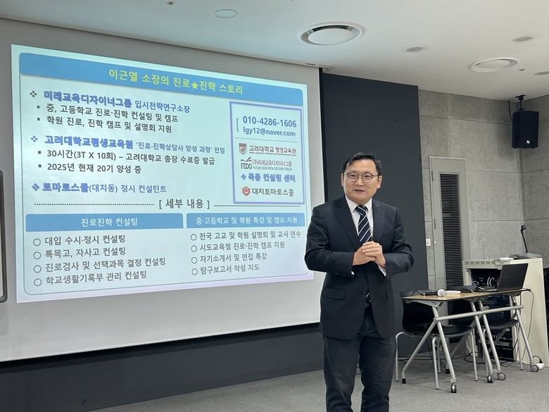 [서울 세계타임즈=이장성 기자] 서울특별시의회 허훈 의원(국민의힘, 양천2)이 이사장을 맡고있는 사단법인 행복교육누리가 30일(목) 오전 10시 40분, 현대백화점 목동점 문화센터 제1강의실에서 양천구 학부모들을 대상으로 진로진학 특강을 성황리에 마무리했다. 이날 특강은 ‘초·중등 시기의 진로진학 준비 전략’을 주제로 고려대학교 평생교육원 전임강사 이근열 소장이 맡았다.