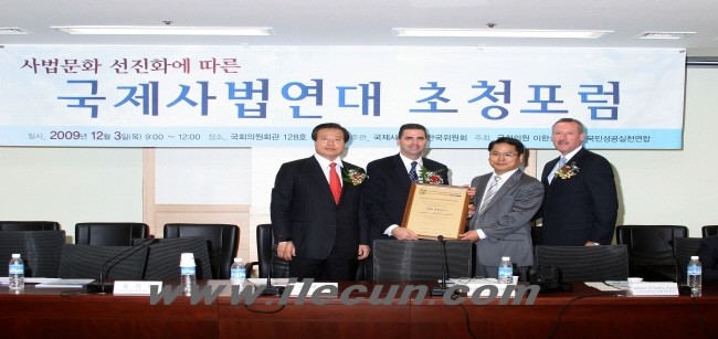 (사진=미국 국제사법연대 Robert Kugler 사무총장 외 임원, 대한민국 국회 초청 국제사법연대 포럼 (총괄기획 국제사법연대 한국위원장 유우종 교수) 국회 유선호 법사위원장, 이한성 국회의원)