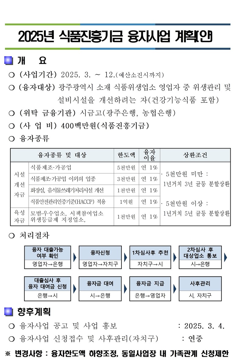 융자 대상은 식품안전관리인증기준(HACCP) 지정업소 또는 지정 준비업소 1억원, 식품제조·가공업소 5000만원, 식품접객업소 등은 3000만원 이내에서 신청 가능하다. 융자 이율은 1년 거치 3~5년 균등분할상환(금리 연 1%)이다.
