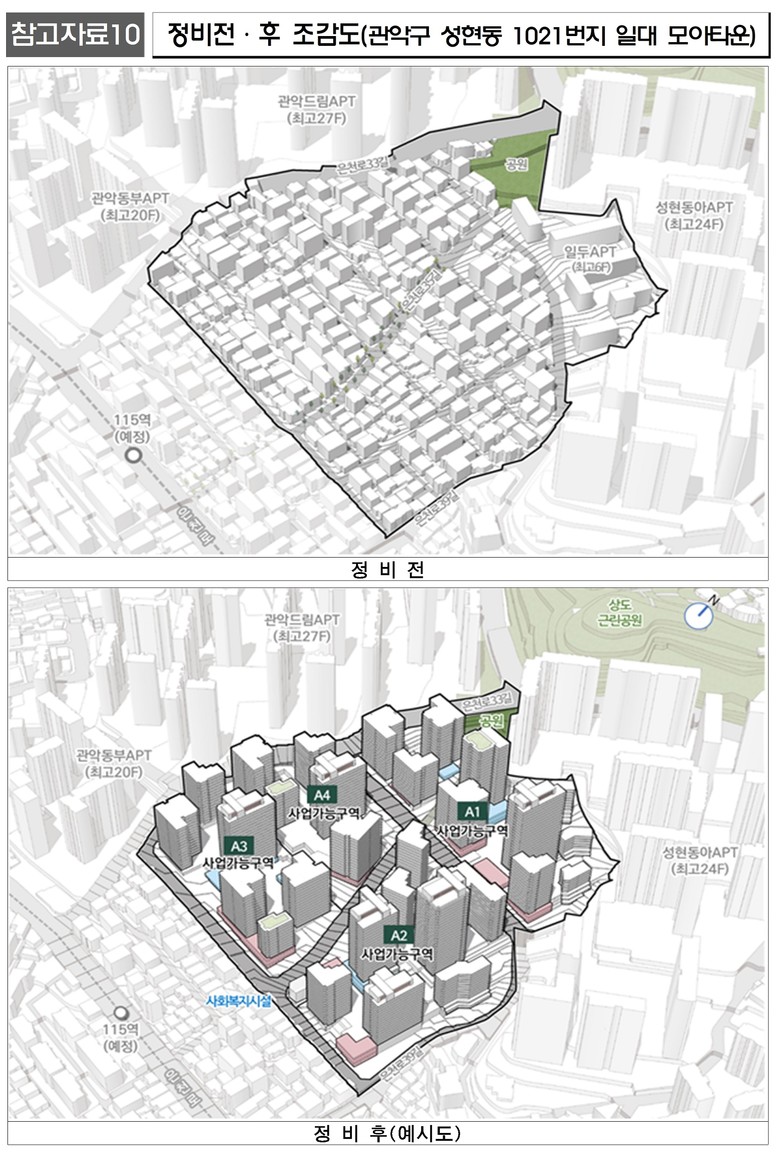 관악구 성현동 1021번지 일대(면적 70,948.1㎡) 모아주택 4개소에서 기존 1,385세대보다 624세대 늘어난 총 2,009세대(임대 254세대 포함) 주택이 공급될 예정이다.