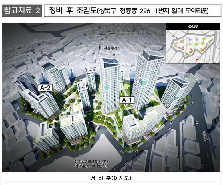 성북구 정릉동 226-1번지 일대(30,111.1㎡)는 모아주택 2개소를 통해 총 782세대(임대 69세대 포함)가 공급된다. 세분화된 도로체계와 높은 경사로 개발이 어려웠던 지역이나, 이번 모아타운 관리계획으로 체계적인 사업 추진이 가능해졌다.