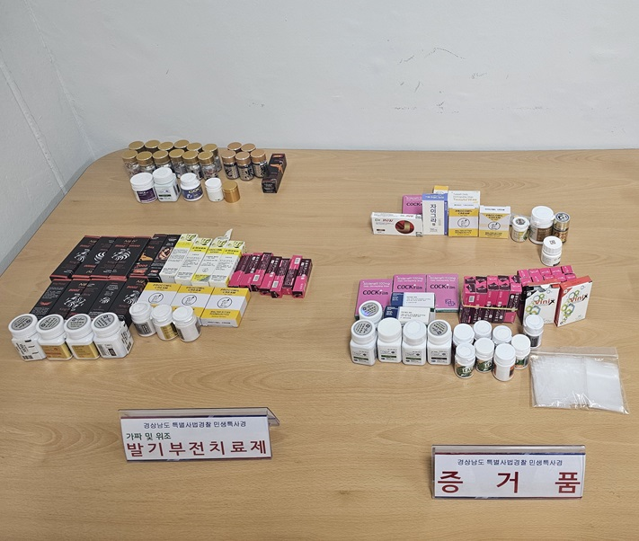 - 성분 검사 결과, 1일 권장 복용량보다 4배나 많이 함유된 것도... [세계타임즈=경남 최성룡 기자] 경상남도 특별사법경찰(도 특사경)은 도내 성인용품 판매업소 등을 일제 단속해 짝퉁 발기부전치료제, 조루증 치료제, 사정지연제 등의 불법 성기능 개선 의약품 등을 보관하고 있거나 판매한 성인용품점 영업주와 온라인으로 판매한 17명을 검거해 수사 중이라고 밝혔다.