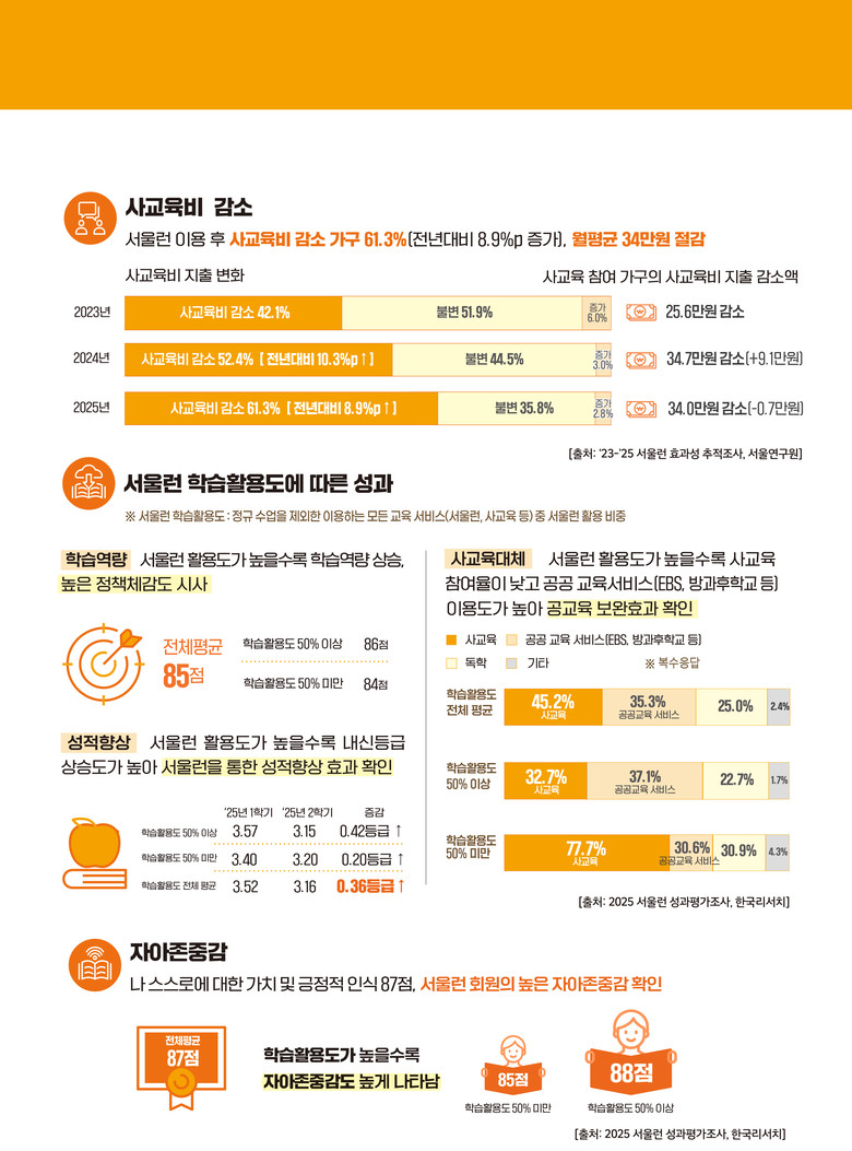서울런 이용 가구 중 ‘사교육비가 줄었다’고 응답한 비율은 ’25년 61.3%로 전년(52.4%) 대비 8.9%p 상승했으며, 월평균 절감액도 ’23년 25.6만 원→ ’25년 34만 원으로 늘어 가계 사교육비 절감 효과가 확인됐다.