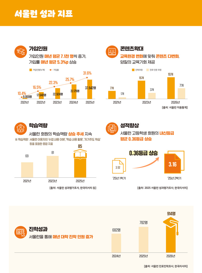 정진우 서울시 평생교육국장은 “서울런이 3년 연속 대학 합격자 증가부터 사교육비 절감, 학습역량 향상, 취업자 증가까지 지원분야 전반에서 성과를 입증하기 시작했다”며, “올해부터는 변화하는 시대상에 걸맞은 AI 역량 강화 등 학습뿐만 아니라 진학, 진로, 취업까지 실질적으로 뒷받침하는 종합 플랫폼으로 발돋움시킬 것”이라고 말했다.