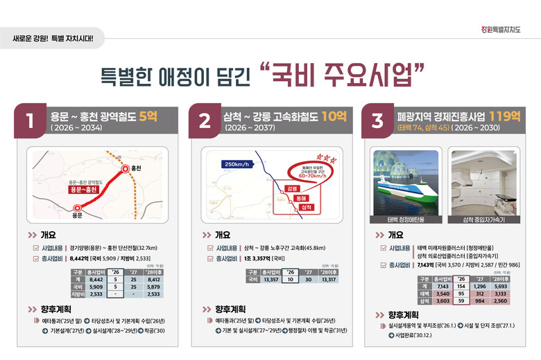 아울러, 특별한 애정이 담긴 국비 사업에 대해 김진태 지사는 “자나깨나 용문~홍천 광역철도, 앉으나 서나 삼척~강릉 고속화 철도가 예타 진행 중인데도 정부 예산안에 반영돼 예타 통과에 청신호가 켜졌다”고 강조했고, 또, “8월 20일 통과된 폐광지역 경제진흥사업도 정부예산안과 동시에 진행된 것으로 정부의 강력한 추진 의지가 반영된 것”이라고 덧붙였다.