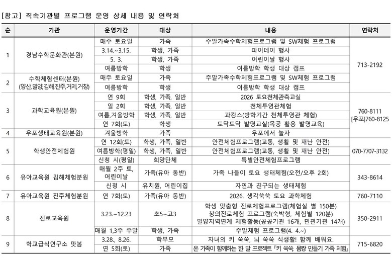 각 기관별 상세한 주말 체험프로그램 내용과 신청 방법은 해당 기관 누리집 또는 ‘경상남도교육청 통합예약포털(service.gne.go.kr/yeyak)’에서 확인할 수 있다.