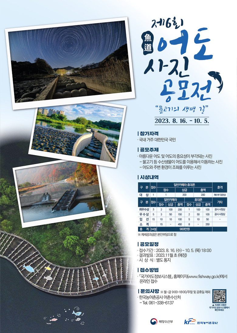 올해로 6회째를 맞는 「어도사진공모전」은 아름다운 어도(魚道)* 사진을 통해 어도(魚道)의 중요성에 대한 국민적 공감대 형성을 위해 마련됐다.