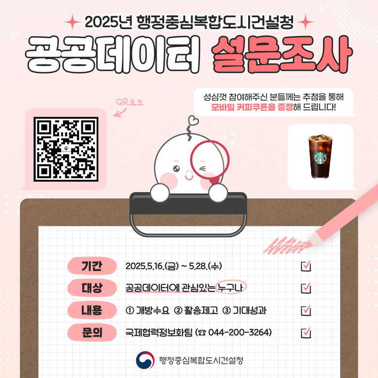 이번 설문조사는 국민의 수요를 정확히 파악하여 맞춤형 공공데이터 정책을 수립하기 위한 것으로, 조사항목은 ▲공공데이터 이용 경험, ▲필요한 데이터 분야 및 항목, ▲데이터 제공 방식 선호도, ▲공공데이터 기반 서비스 제안 등 총 12개의 문항으로 구성되어 있다. 공공데이터에 관심 있는 국민이라면 누구나 행복청 누리집과 공식 SNS(블로그, 페이스북, 인스타그램, 유튜브, X)를 통해 참여할 수 있다.