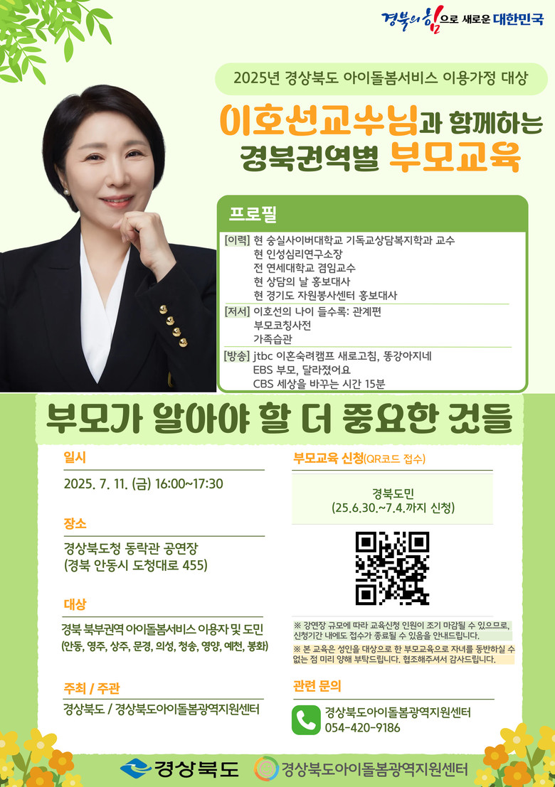 이번 교육은 7월부터 9월까지 총 3회, 권역별로 나누어 경북도청 동락관(안동, 7.11.), 뱃머리평생교육관(포항, 8.8.), 구미강동문화복지회관(구미, 9.12.)에서 진행되며 도내 아이돌봄서비스 이용자와 일반 도민 약 1,000명이 참석할 예정이다.
