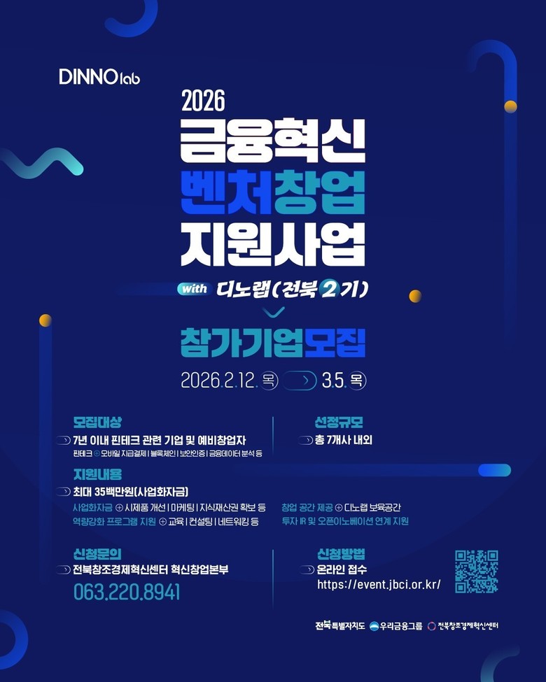 전북자치도는 핀테크 분야 (예비)창업자와 창업 7년 이내 스타트업을 대상으로 ‘2026년 금융혁신 벤처창업 지원사업’참여기업을 3월 5일까지 모집한다고 19일 밝혔다.