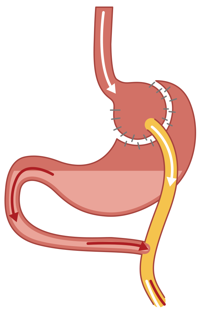 장기적 체중감량과 동반질환, 특히 대사질환 개선에 탁월한 효과를 보여준다. 오랜 세월 유효성이 증명된 수술로 미국에서 가장 많이 시행되고 있으며 통상적으로 표준수술로 인정되는 수술이다. 위의 상부를 절단하여 15-20cc 도 용량의 작은 주머니가 만들어지고 비교적 짧은 소장 우회가 Y자 모양으로 이루어져 나머지 하부 위, 십이지장, 근위공장이 우회되게 된다. 장내 호르몬 분비의 변화를 초래하여 제2 당뇨병 등 대사 증후군의 치료에 단순한 제한적 수술보다 더욱 유용하다. 체중 감량의 효과는 수 술 후 6개월까지 급속하고 18-24개월까지 꾸준히 감량된다.