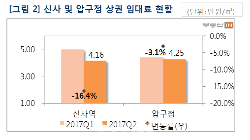 월 임대료, 전분기 대비 신사 16.4% 압구정 3.1% ↓