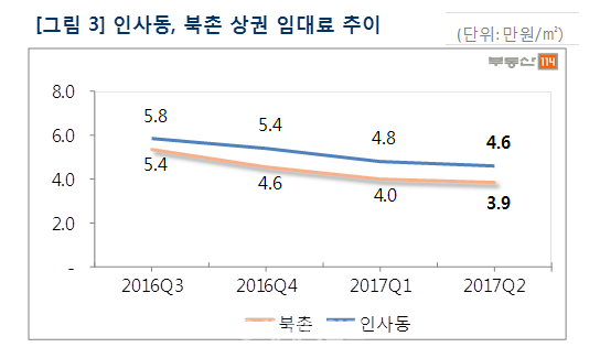 인사동과 북촌 상권은 지난 해 3분기 이후 3분기 째 임대료 하락세가 지속 중이다. 특히 관광객 비중이 높았던 인사동은 중국인 관광객 감소 영향으로 유동인구가 현저히 감소했다. 일반 수요자들의 방문이 이뤄지긴 하지만 관광객 대상 업종이 대부분이라 소비진작을 유도할 거리가 없다.