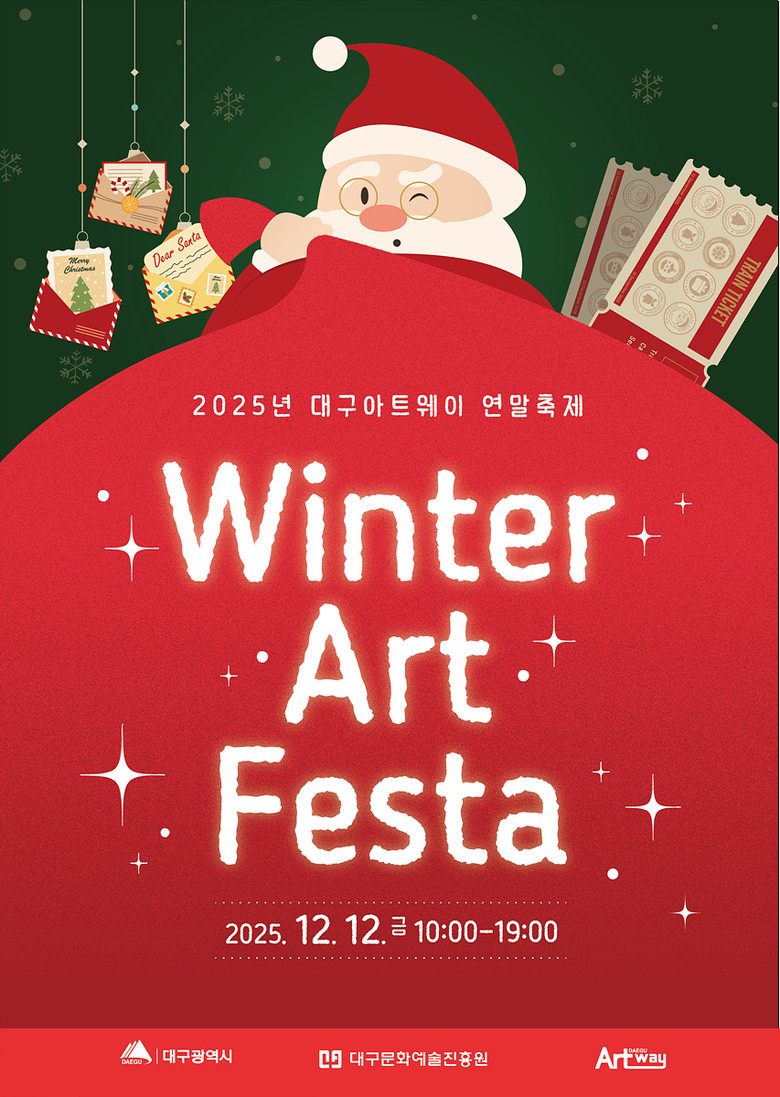 ▸ 시민 참여 이벤트, 입주예술인 오픈스튜디오, 플리마켓, 특별공연 등 다채로운 볼거리와 체험 프로그램 운영 [세계타임즈=대구 한윤석 기자] 대구문화예술진흥원 문화예술본부(본부장 방성택)가 운영하는 대구아트웨이(이하 아트웨이)는 연말 축제 ‘윈터아트페스타’를 오는 12월 12일 금요일 대구아트웨이 전 구간에서 개최한다.