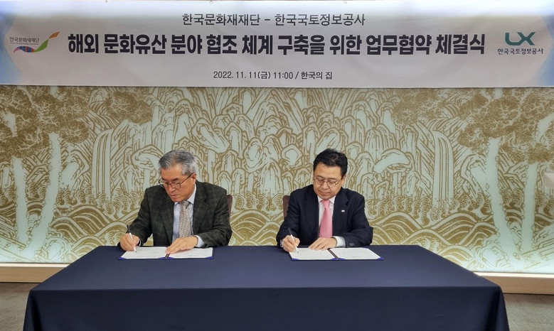 LX공사 최송욱 공간정보본부장과 한국문화재재단 김동하 기획이사는 11월11일 서울한국의집에서 ‘문화유산 보존관리·공간정보 분야 국제개발사업 협력을 위한 업무협약’을 체결했다.