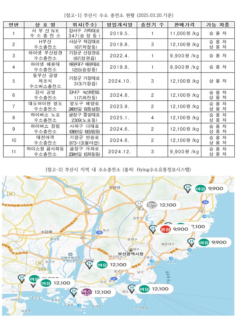 마지막으로, 올해 부산시는 산업통상자원부가 지원하는‘2025년 예비수소전문기업 지원사업’에 최종 선정되어 2년간 국비 9억 확보로 수소 관련 기업 육성에 나서는 만큼, 부산시가 적극적으로 지역 내 원자력발전을 이용한 핑크수소1) 또는 기장 해수담수화 시설을 활용한 그린수소2) 등에 관한 수소 생산 기술 및 안정적인 수소 공급처를 확보함으로써 수소차의 생산, 정비, 유지 등과 관련된 수소산업 생태계를 성장시킬 수 있을 것이다.”라고 하여 부산시의 적극적인 행·재정적 지원을 요청하였다.