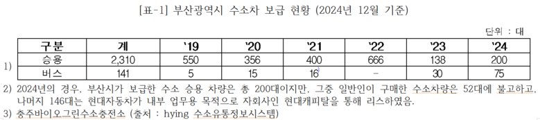 김형철의원은 “부산시 자료에 의하면 2024년 12월 기준, 부산시의 수소차1)는 승용차 2,310대, 버스 141대로 총 2,451대이지만, 2019년부터 2024년까지 수소차 공급 증가율을 살펴보면 승용차의 경우 –18.32%2), 버스의 경우는 71.88%로 나타난 것으로 미루어 보았을 때, 승용차 증가율이 감소한 것은 2022년까지 4개에 불과한 수소충전소의 추가 구축이 늦어진 데에다 수소 가격조차 올라 각종 지원과 세제 혜택으로도 메꿀 수 없는 전기차 대비 높은 연비 차이3)에 기인한 것”이라 설명하였다.