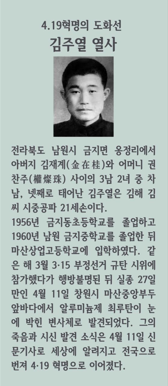 [세계타임즈 백진욱 기자] 제1회 김주열 열사 기념사업 기념식 · 음악회 가 2022년 10월 29일 (토) 오후3시 전북 남원시 양림길에 위치한 사랑의 광장음악분수대 특설무대에서 열린다.