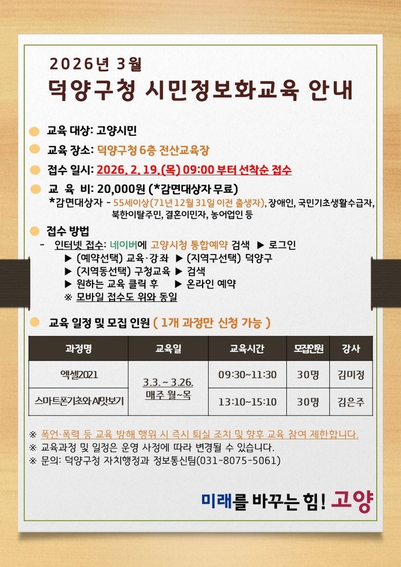 교육은 오는 3월 3일부터 26일까지 덕양구청 전산교육장에서 진행되며, 수강 신청은 이달 19일 오전 9시부터 덕양구청 누리집을 통해 가능하다.