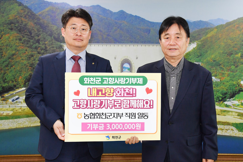 [화천군 세계타임즈=김민석 기자] NH농협 화천군지부(지부장:민연홍)는 지난 14일 최문순 화천군수를 방문해 고향사랑기부금 300만원을 기탁했다.