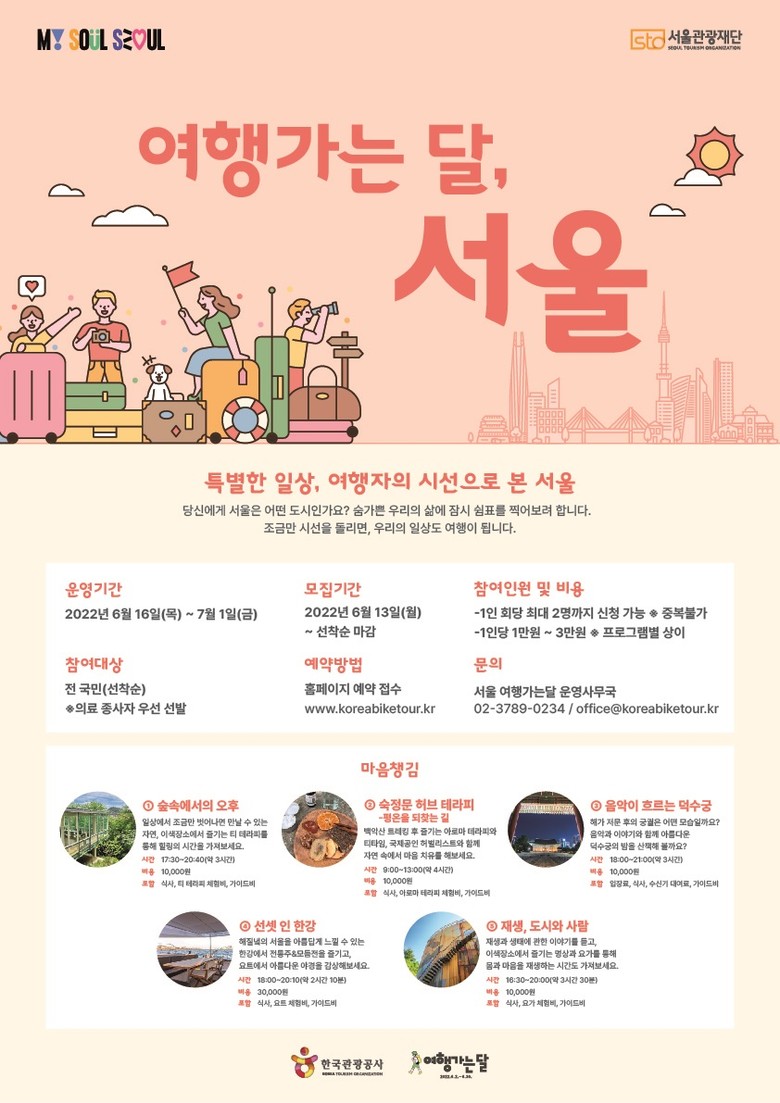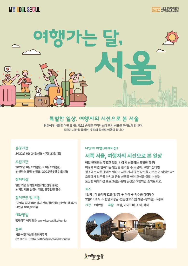 서울시와 서울관광재단(대표이사 길기연)은 서울 관광소비 촉진 및 관광시장 회복을 위해 공동으로 6월 16일부터 7월 15일까지 한 달간 ‘서울 여행가는 달’로 지정하고, 사회적 거리 두기 해제 이후 새로운 관광 트렌드에 맞는 마음챙김·워케이션 등 다채로운 서울 관광 프로모션을 선보인다.