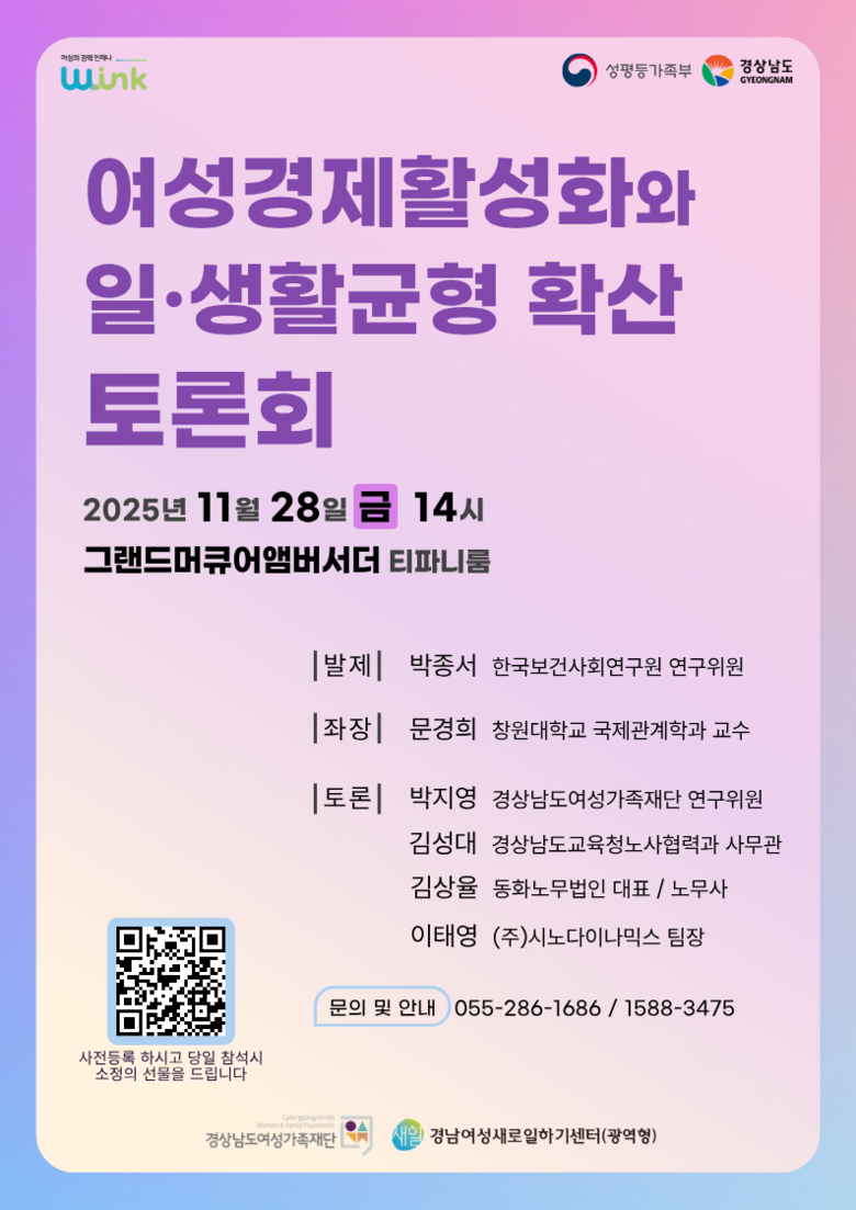 경남도가 주최하고 경남여성새로일하기센터(이하 경남새일센터)가 주관하는 이번 토론회는 여성 경제활동 활성화와 일·생활균형 문화 확산에 대한 지역사회 분위기를 조성하고자 마련됐다.