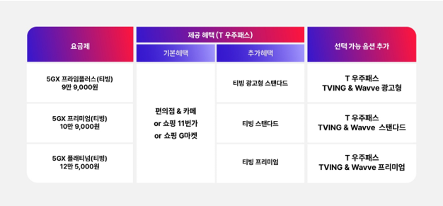 5GX 프라임플러스(티빙) 이상 요금제를 쓸 경우 추가 옵션으로 ‘T 우주패스 TVING & Wavve’ 결합 상품도 선택할 수 있게 된다. 5GX 프라임플러스(티빙) 요금제는 ‘광고형’, 5GX 프리미엄(티빙) 요금제는 ‘스탠다드’, 5GX 플래티넘(티빙) 요금제는 ‘프리미엄’ 상품을 각각 옵션으로 선택 가능하다.