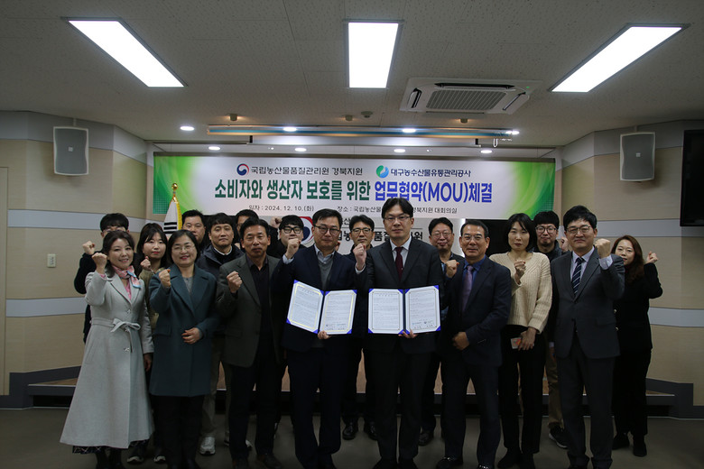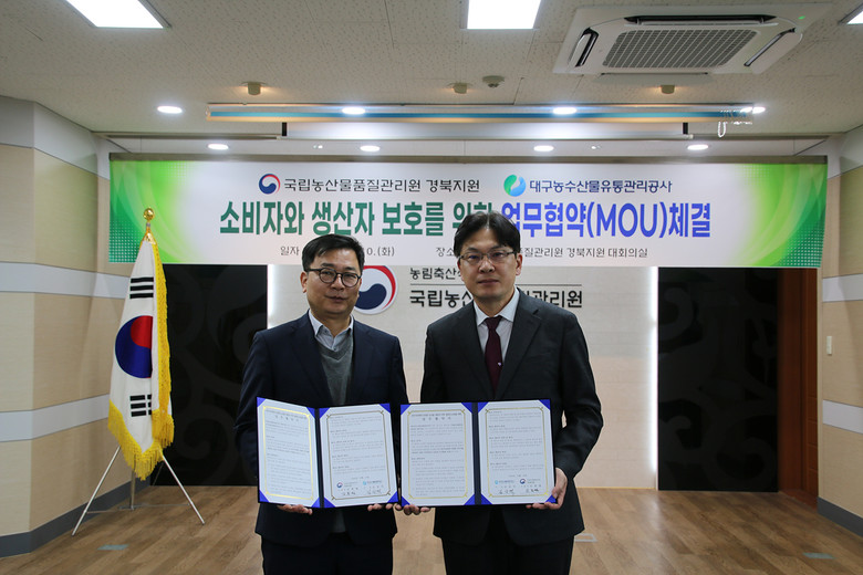 대구농수산물유통관리공사(사장 김상덕)와 국립농산물품질관리원 경북지원(지원장 김종필)은 12월 10일(화) ‘대구시민에게 안전한 농산물 공급과 지역생산자 보호’를 위한 업무협약을 체결했다.