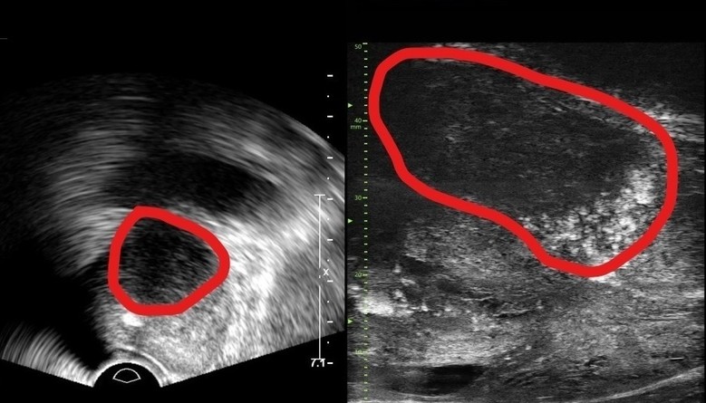 | ▲기존 전립선 초음파 사진(좌) 및 마이크로 초음파 사진(우). 기존 초음파는 전립선 부위(동그라미 친 부분)의 음영 차이로만 병변을 확인했지만, 마이크로 초음파는 높은 해상도를 통해 종양과 주변 조직의 모양까지 확인가능하다.(사진=분당서울대병원) |