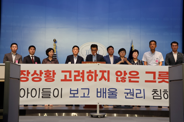 강득구 의원은 “ 법제처는 법리적 판단에 따라 회답했다고 했지만 , 교육현장의 작동방식을 생각하면 기계적 해석으로 볼 수밖에 없다 ” 며 , “ 유치원과 초등학교 수가 15,000 개에 이르고 , 어린이의 수가 325 만 명에 이르는데 미칠 파장을 전혀 고려하지 않았다 . 이를 집행하는 교육부와 경찰청의 행정은 더 비판받아 마땅하다 ” 고 지적했다 .