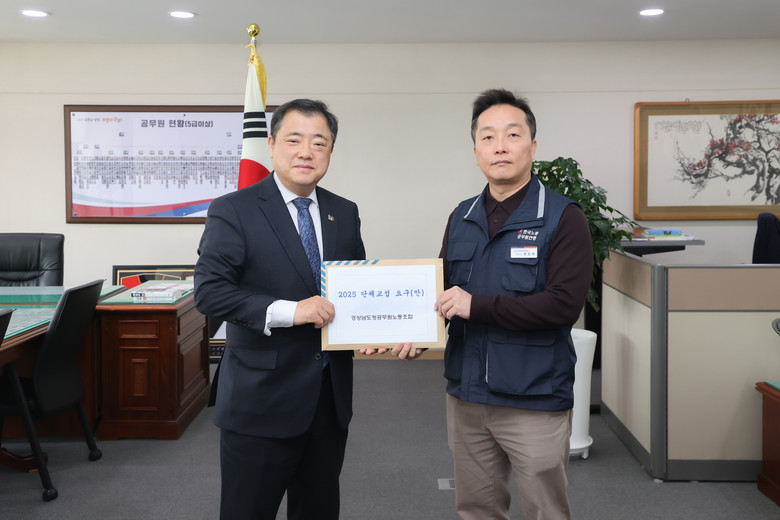 - 박명균 부지사 “성실히 협의하고 책임 있는 자세로 임할 것” [세계타임즈=경남 최성룡 기자] 경상남도청공무원노동조합(위원장 한진희)은 21일 도청 행정부지사 회의실에서 2025년 단체교섭 요구안 전달식을 개최하고, 경상남도와 성실한 교섭을 추진하기로 상호 합의했다.