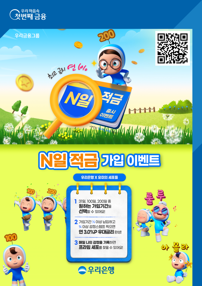 우리은행 관계자는 “‘N일 적금’은 ‘유미의 세포들’ 웹툰에 등장하는 캐릭터를 활용해 적금 관리에 새로운 경험과 재미를 제공하는 상품”이라며, “감정 스탬프를 적립하는 감정다이어리가 상품 만기까지 금융자산을 키우는 재미와 동기부여가 되길 바란다”고 밝혔다.