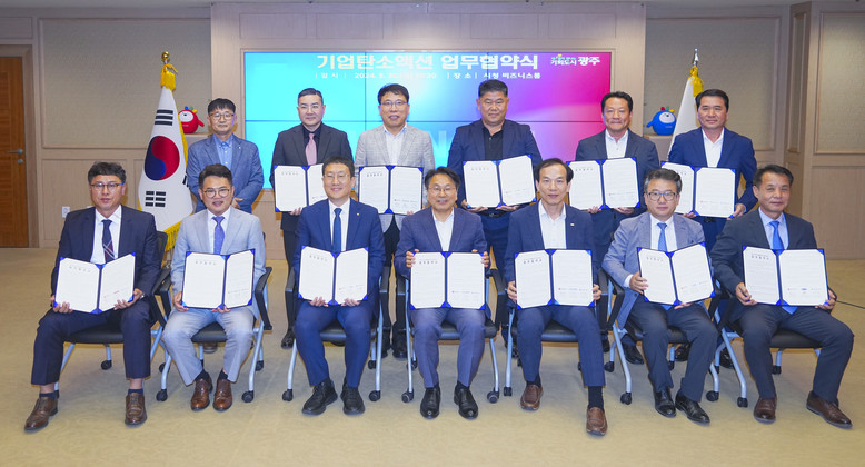 광주광역시(시장 강기정)는 30일 시청 비즈니스룸에서 중소·중견기업 12개사, 한국에너지공단과 ‘광주 2045 탄소중립을 위한 기업탄소액션 업무협약’을 체결했다.