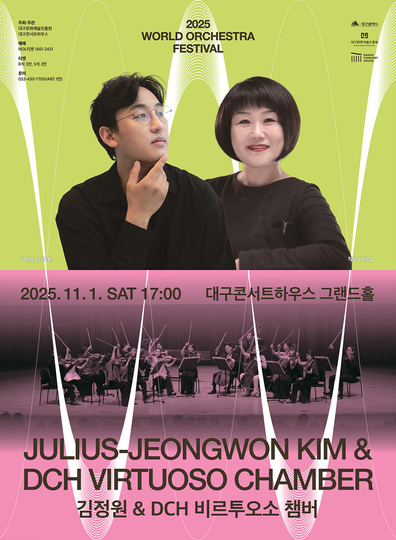 ▸ 피아니스트 김정원, DCH 비르투오소 챔버와 모차르트 협주곡 21번 협연 [세계타임즈=대구 한윤석 기자] ‘김정원 & DCH 비르투오소 챔버’가 11월 1일(토) 오후 5시, 대구콘서트하우스 그랜드홀에서 열리는 ‘2025 월드오케스트라페스티벌’ 무대에 오른다.