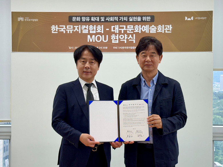 ▸ 대구, 뮤지컬 도시 위상 강화 및 신작 개발 거점으로 [세계타임즈=대구 한윤석 기자] (재)대구문화예술진흥원 대구문화예술회관(관장 김희철, 이하 ‘대구문예회관’)은 한국뮤지컬협회와 업무협약(MOU)을 체결하고, 창작 뮤지컬 발전과 글로벌 네트워크 강화를 위해 협력하기로 했다.